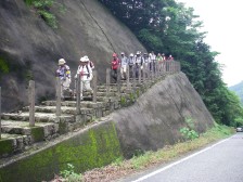 ●天気に恵まれ、夏日の山行きとなった。錦鶏ノ滝は白い飛沫を上げていた。暑さが飛んでゆく。萩往還駐車場に戻り、往還道を歩き始める。緑の苔のついた石畳はツルツル滑り、足元に力が入る。「クマ注意」という看板のある板(坂)堂峠から階段の山道を上り下りとアップダウンが何回あったことか、汗がポトポト流れ落ちる。ショウゲン山に立ち寄るとなんとササユリが咲いている。誰かが植えたのだろうか・・・・それでも心が和む。山頂まじかでは木立がなく、太陽の暑さに負けそうになる。しかし、山頂に着いて山口市街、西鳳翩山の山並み、360度の展望は心地よい風とともに疲れを忘れさせる。下山は二ツ堂峠の方へと下る。こちらは木立の中で森林浴を堪能しながらの歩きだった。板(坂)堂コースとのあまりの違いにびっくり。ファミリーコースと言われる所以であろう。帰りはユラリ温泉でお風呂に入り無事帰宅。皆様、スタッフの方々、お疲れ様でした。CL志水