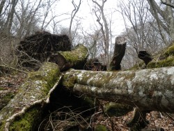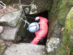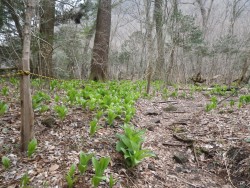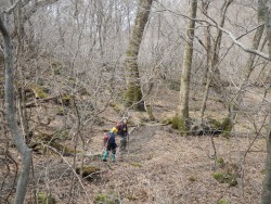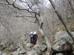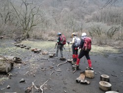 ●最後の例会登山は、ユキワリイチゲの花を探して、男池から氷結の風穴への往復コースでした。心配された雨が降ることもなく、あまり高低差のない登山道をさわやかに歩くことが出来ました。ユキワリイチゲの花は、往路では未だ時間が早いために、蕾だけしか見ることが出来ませんでした。帰りの楽しみに取っておいて、山芍薬を探しながら途中の岩場を用心しながら長い道のりを風穴まで進みました。昼食後、アイゼンを付けて風穴の中へ順番に降りて行きました。私は、10年程前に風穴の中に降りたことがあります。その時は5月という暖かい季節なのに今回よりもっと凍っていてライトを照らすと穴の中全体がキラキラ輝いていたことを記憶しています。温暖化の影響なのでしょうか?