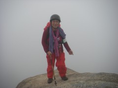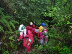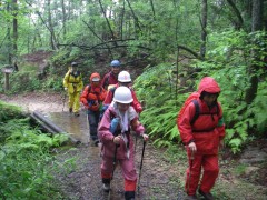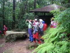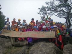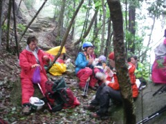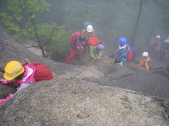 ●山行日:2010年7月11日(日)雨 ●コース:@自然観察コース Aのんびりコース ●参加人数37名 ●集合場所:苅田町役場、下曽根駅(モール側)、JR小倉駅北口 ●バス:中型バス(筑豊西鉄) ●スタッフ:CL 羽瀬川 SL平川(班長4名 フリー5名) ●行程:苅田町役場前(6:00)→下曽根→小倉駅北口→王司SA→下松SA→大竹I.C→登山口(11:00)→@コース 出発(11:20)→朝日岳鞍部(12:25)昼食→中岳(13:00) →夕陽岳(13:51) Aコース 出発(11:00)→夕陽岳(13:00) @A合流下山開始(14:05)→4合目小屋(15:00)→登山口(15:30)→バス乗車(15:40)→小瀬川温泉(16:10)入浴→出発(16:50)→吉和I.C→鹿野SA→壇ノ浦PA→小倉駅北口(19:50)→下曽根駅→苅田町役場前 ●梅雨期にも拘らず多数の参加者で雨の北九州を出発。登山口で雨具着用、準備体操後、のんびりコースが先に登山開始。自然観察コースはスワミベルト等の確認をして20分後に出発した。沢歩き並みに水が流れ落ちる石段を上り詰めて鞍部で昼食。朝日岳、中岳とガスで展望は期待はずれだったが鎖場はスリル満点でシュリンゲの使い方を教わりながら全員無事に夕陽岳の山頂でのんびりコースのメンバーと合流した。集合写真後、ザイル使用の勉強会をしてから下山開始、せせらぎが急流と化した沢を4度渡って登山口に着き、見上げると威風堂々たる迫力の岩峰が目を覆った。自然の畏怖を強く感じた三倉岳だった。 CL羽瀬川二代 |