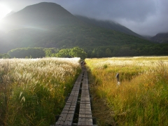 | 朝陽を浴びる湿原(奥は指山) | ||