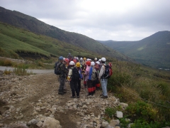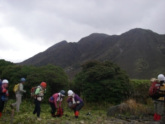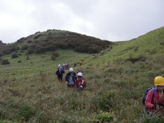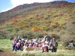 ●山行日:2009年10月18日(日) 曇り ●コース: 長者原→すがもり越→西峰→大鍋→北峰→雨ケ池→長者原 ●参加人数:26名 ●集合場所:JR小倉駅北口、下曽根駅前、苅田町役場前 ●バス:マイクロバス+普通車 ●スタッフ: CL栗焼タミ子) 班長2名 フリー5名(敬称略) ●行程:JR小倉駅北口(6:30) 〜下曽根駅(6:45)〜苅田役場前(7:00)〜メタセの森〜長者原(9:40)〜すがもり越(11:40)→大鍋(13:45)〜昼食 (14:10)〜北峰(14:35)〜雨ケ池(17:00)〜長者原(18:30)〜メタセの森〜苅田役場前〜 下曽根駅〜小倉駅北口(21:50) ●諸事情により前泊チームが結成された。男性3人に女性2人である。星空を見ながら足湯につかった。少々寒いがキャンプはいいものだ。翌朝、散歩をしたりコーヒー飲んだりしているとバスが到着。体操をして出発である。参加者は笑顔が絶えない。天気は雲が広がっているが、雨は振りそうにない。すがもり越までの岩場を喘いで一息つくと再び急登を喘ぐことになる。西峰肩より北に向かい、やや降ると上りとなる。紅葉がぼちぼち見えてきて大鍋を期待する。予定よりも遅れているため本峰をあきらめ、南峰下方よりお鉢を大鍋目指し下って行く。青空も広がり、紅葉も素晴らしい。大鍋の底に降りて周りを見渡すとその感動はさらに増す。遅い昼食を早々済ませ、北峰を目指す。北峰は狭く一列でないと進めない。ここからしばらくお鉢を歩く。危険なところもあるがスタッフで協力してクリアしてゆく。雨ケ池までの降りは、勾配がきつく滑りやすい。しかし、ヘルメットのおかげで安心である。無事雨ケ池に到着したが、既に17時となり、すぐに日が暮れるだろう。しばらく歩くと森林の中となりキャップライトを装着する。振り返るとキャップライトの明かりが連なって不思議な光景となった。18時30分無事長者原に着く。紅葉とナイトウォークが楽しめた1日であった。 CLの代筆 清水 裕 |