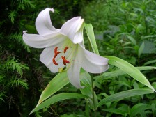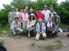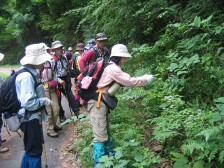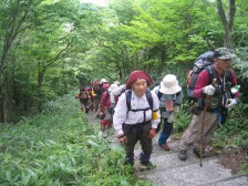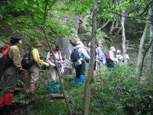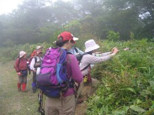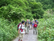 ●山行日:2007年6月10日 天気:曇り ●コース:@五万堂渓谷入口−赤滝−長野山 A五万堂渓谷入口−馬糞ケ岳−長野山 ※下山後 温泉入浴(石船温泉) ●参加人数:32名 ●集合場所:苅田役場駐車場・小倉北口 ●バス小型2台 ●スタッフ CL清水、SL川野、班長4名 フリー5名 (敬称略) ●行程:苅田役場(6:00)−小倉駅北口(6:30)−@五万堂渓谷入口(9:00)−赤滝−長野山山頂 A五万堂渓谷入口(8:50)−馬糞ケ岳山頂(12:20)-長野山山頂(14:50) 長野山山頂よりバスに乗車し、石船温泉へ ◆@コース報告 自然観察コースは最初の予定は登山口から赤滝を見た後、赤滝の案内板まで戻り、2000段という長い長い階段をひたすら登る筈だった。想像しただけでも嫌になる気分だったが代表の「赤滝から沢沿いを登り、冒険しませんか?」の一言で全員一致の意見で藪漕ぎをする事になった。膝の高さまである笹を掻き分けながら、目的地に辿りつく事が出来るのか?不安な気持ちを抱きながら、みんなの顔は必死ながらも楽しそうだった。みんな冒険が好きだな〜と、つくづく感じた。期待していたササユリの花も綺麗な姿を少しだけでも見る事が出来、皆、満足顔の山行だった。SL川野 ◆Aコース報告 今回は当会としては始めての小型バス2台での山行だ。色々と問題点をクリアして実行日となった。苦労の甲斐あってきれいに開花したササユリが見れた。葉が本当に笹のようで改めて感動した。馬糞ケ岳山頂で昼食となったが、ササユリの蕾が多いのには驚いた。昼食を早々と済ませ、長野山を目指すが、@コースのグループが遅れていることを知り、ササユリを捜しながら進むことに。未だ蕾が多いが「見つけた!」と声を出しながら全員無事に長野山山頂に着いた。遅れ気味のメンバーもいたが、皆、がんばって全員無事で登頂でき、満足顔な集合写真が記念となったはずだ。帰路のバスではこの会定番となったビンゴゲームで盛り上がり、2台のバスも無事に着いた。今回、もう1台のバスの運転をしていただいた代表、本当にお疲れ様でした。CL清水 |