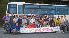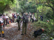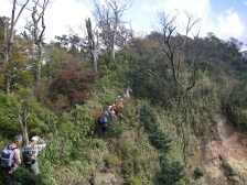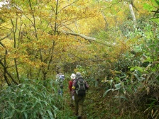 ●天気は快晴に恵まれ、気温も心地よく、登山には最適!と出発しましたが少し遅れて出発した為、行程通りには進まない1日でした。予定していた2回目の休憩所「道の駅 大山村」も変更して「カメルーン・キャンプ地」になりました。私を含めて初めて行く人もいたので社会見学にはなりましたが、トイレの数が2コしか無かったのでトイレ渋滞になりました。ここで出発が更に遅れた為、登山口である「杣の里渓流公園」には1時間30分遅れて到着しました。この遅れた時間を取り戻す為にロングコースの方々は休憩も昼食も、わずかな時間しか取れずハードだったのでは??こんな風に行程通りにはいかずバタバタした1日でしたが、今回の山行のタイトル通り紅葉も展望も楽しむ事が出来ました。今まで出会った事のない花々に、たくさん出会えて皆さん大喜びでした。御前岳〜釈迦ヶ岳に行く間、何カ所か慎重に登らないといけない鎖場や岩場があったり、釈迦ヶ岳〜矢部越しに下りてくる時に道に迷いそうになったりもしましたが全員が無事に下山出来た時はCLとしての安心感と皆さんとの連帯感を感じました。やはり皆さんのご協力無しでは「山の会」としての登山は成り立たないと思いました。下りて来た後の椿ヶ鼻ハイランドパークでの入浴では疲れを癒す事が出来ました。今回、バスの中での初めてのイベントで会員のFさんが自然についてのクイズをして下さった事は、とても勉強になり盛り上がった事と思います。Fさん、どうも、ありがとうございました。今後とも、よろしく、お願い致します。 CL川野