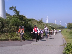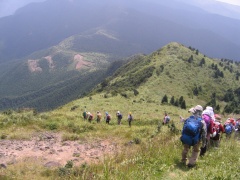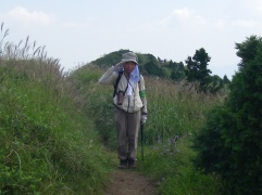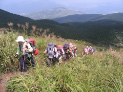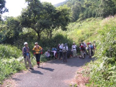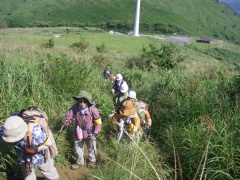 ●山行日:2009年9月6日(日) 晴 ●コース: 俵山峠→俵山→護王峠→堀渡登山口 ●参加人数:37名 ●集合場所:JR小倉駅北口、苅田町役場前、下曽根駅前 ●バス:中型バス(西鉄バス筑豊) ●スタッフ: CL平川善博(Aグループ) SL 屋部博嗣(Bグループ) 班長4名フリー6名(敬称略) ●行程: 苅田役場前(6:00)~下曽根駅(6:20)~JR小倉駅北口(6:40)~鞍手PA(2名乗車)~熊本空港・益城IC~(9:20)俵山峠(9:40)→(11:25)俵山(12:10)~護王峠 (12:40)~堀渡登山口(14:00)~久木野温泉[木の香湯](16:00)~熊本空港・益城 IC~直方PA(2名下車)~小倉駅北口(19:20)~下曽根駅~苅田役場前 ●今回はゆったり登山の企画である。1コースのみ37名と多数のためAグループ17名が 先発し5分後にBグループ20名が出発することにした。例会登山では久し振りに天候 に恵まれたのはよいが山頂気温が31℃、遮るものなし、風なしと暑ーい暑ーい登 山であった。ややガスがあったが、移り変わる展望を楽しみそして、多くの花が迎えてくれた。マツムシソウの凛とした貴婦人みたいな姿に心が癒される。 下山時に俵山を振り返るとBグループ隊列が遠方に見える。山が動いているようにも見える。手を振り声を出す女性の表情は幼い頃の顔?!護王峠でボランティアの元祖甲斐有雄氏の道しるべに敬礼。牧場へのワインディングロードで阿蘇山の威容を眺めながら牛とにらめっこし無事下山。温泉でゆっくり汗を流したあとの泡の出る飲物がうまかったこと! CL 平川善博 |