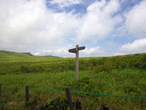 | この分岐は八島湿原へ(11:47) | 車山乗越(11:50) | 古い道標は文字が消えかかっている |