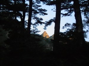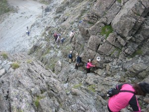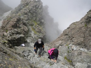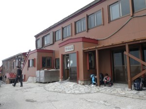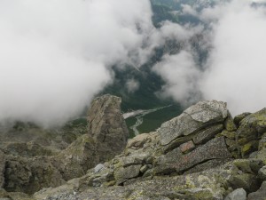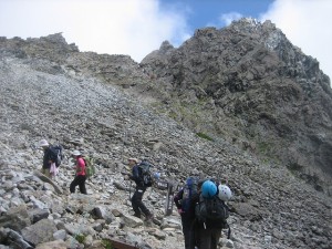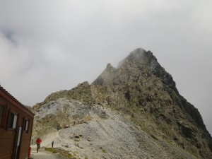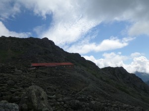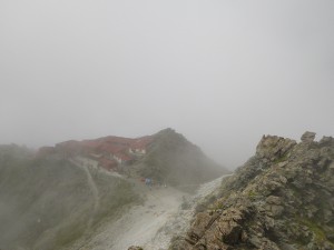 | 山荘に荷物を置いて穂先にチャレンジ | 山荘が小さく見える | 結構しんどい |