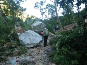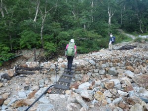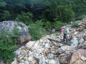 | ガレ場を歩く | 大きな石が目立つ | 木の橋を渡る |