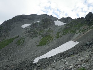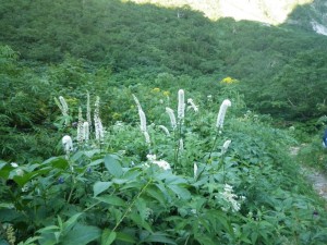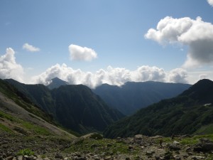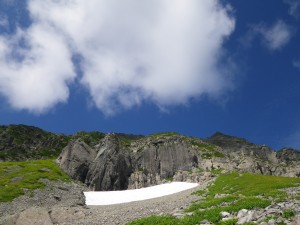 | 振り返ると常念岳などの峰々が見える | 雪渓 | 右は殺生ヒュッテ |