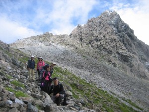 | 2011年8月27日(土) 天気 晴れ 昨夜は一回トイレのため目を覚ましたが、朝まで熟睡できた。4時頃起きると空には星が・・・・天気は良さそうだ。山小屋の朝食は早い5時からである。今日は9時間の行程なので食事を済ませてたらすぐに出発である。ロッヂを出ると槍ケ岳の穂先が朝日を浴び、私たちを待ち望んでいるようだ。ガレ場を歩き、林の中を抜けるとトリカブトとショウマの花々を見て砂地を歩く。テント場に出たらそこがババ平である。なんでババなんだろう。本当に「ばばあ」のババなのか・・・・またいつもの「なぜ?」を考えながら槍沢沿いに高度を上げて歩く。太陽が沢の突き当たりの峰々を照らしている。五郎沢と石にペンキで書かれているのでここが五郎沢かとぶつぶつ独り言を言いながら通過する。水は流れていない。周りには相変わらずトリカブトの花がたくさん咲いている。道は大きく曲がったと思ったら標識に槍沢大曲りとある。なるほど誰でもこの名を付けるだろう。ちょっと休憩をしていたら岩崎さんが追いついてきた。んーピッチがなかなか早いようだ。先に道を譲り、私たちのペースで歩き始める。前方に雄大な峰々が朝日を浴びている。槍ケ岳の穂先は見えないが、きっとこれから歩く稜線であろう。陽が私たちにも当たり出したため暑い。休んでいると下から団体さんが歩いてきている。大岩を過ぎ、7時45分、天狗原の分岐に着いた。勾配はどんどんきつくなるようだ。岩崎さんはここから天狗原を経て南岳へと向かうとのこと。水場で水を補給して小さな沢を横断すると槍ケ岳の穂先が見えてきた。なぜ尖がった方が恰好が良いのだろう・・とまたもやどうでもよいことを考え、平らなところで他の登山者も写真を撮っていたが私たちもしばし休憩タイム。写真を撮って歩き始めるがすぐにまた、水場がある。MORIさん曰く「ここが一番うまい」と言われペットボトルに入れて飲むが正直わからなかった。石がごろごろとしたまともな道とは言えないルートを歩く。坊主岩屋下と標識があって大槍山荘との分岐のようだ。しばらく歩くと小説「槍ケ岳開山」で読んだ播隆上人が利用したと言う窟があった。イワギキョウやシオガマギクツガザクラなどの花々がたくさん咲いていて石ころだらけの道を飽きることなく歩く。殺生ヒュッテとの分岐辺りまでくると槍ケ岳の穂先がかなり大きく感じる。標高のせいか、かなり体が重い。食べる酸素を補給して急斜面をがんばって歩く。10時40分槍ケ岳山荘にようやく着いた。ザックを置いて水と貴重品をナップサックに入れていよいよ穂先に挑戦だ。上りと下りの道が分かれているところもある。岩を手と足を使い、登って行く。呼吸はかなり苦しい。最初の垂直の梯子をクリアするが、遠くで見たステンレスのような梯子はない。2つ目も錆びたような梯子である。思ったより簡単にクリアして山頂に立てた。頂上に立つだけ最高であるが、欲を言えばガスが切れて展望を味わいたかった。また次回と言うことか・・・・・。記念写真を撮って山荘に戻り、腹ごしらえをして早々に南岳を目指し出発である。次ページへ |