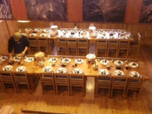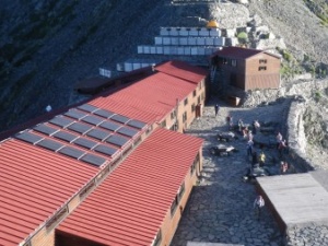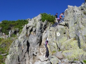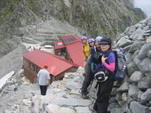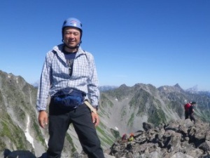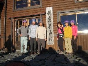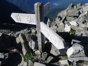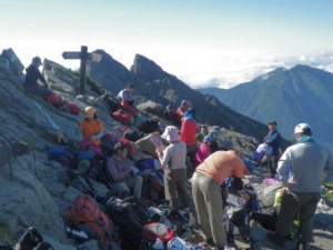 | 2011年8月29日(月) 天気晴れ 「いやー良く寝た」未だ暗い中、顔を洗いトイレを済ませ出発準備をして食堂に向かう。二階から覗くとお兄さんお姉さん達が、朝食の支度をしている。なんか手の込んだ料理のようだ。そう言えば南岳小屋は全て冷食だった。5時ちょうど朝食をいただく。食べているときに日の出が始まった。贅沢な時間だ。 今日は最終日で穂高岳山荘から奥穂高岳、吊尾根を経て前穂高岳に登頂する。そして重太郎新道から岳沢を降り、上高地へと下山する。約7時間半の行程だ。 山荘前で記念写真を撮り6時出発。今日も天気が良い。と浮かれていたが、いきなり絶壁が待ち構えている。登山者が渋滞気味なのでスローテンポでちょうどいい。登りきるとややなだらかになって奥穂高岳にある祠が遠くに見える。岩場をよじ登ると標識があって左に回り込む。右手にはジャンダルムが見えてくる。登山者の賑やかな声が聞こえ出した。奥穂高岳頂上だ。左に祠、右には方位盤がある。その間が狭い登山道となっているため記念写真を撮ろうとする人で大混雑している。しかもここで団体も混じっているようで一層混雑していた。私たちも写真を無事撮って反対側(進行方向)に出ると割と広い平らな場所があるのでここで小休憩をすることにした。これから歩く吊尾根、そして南には梓川を挟んで霞沢岳が見える。また遠くに乗鞍岳が顔を出していた。ここからは一列に並んで岩のヤセ尾根歩きだ。油断すると命はない。前を団体ツアーの登山者が歩いている。言葉から韓国の人達のようだ。南斜面の山腹の狭い道を連なって歩き、8時20分紀美子平に着いた。後から調べてわかったが重太郎新道を完成させた故今田重太郎さんが一緒に手伝いをしていた娘の紀美子さんが亡くなられたのがきっかけに名付けられたそうだ。やっぱり人の名前だった。紀美子平で一息つき、荷を軽くして前穂高岳を目指す。荷は軽くなったが、しばらく降りばかりだったので余計に上りはきつい。ようやくの思いで9時ちょうど前穂高岳頂上に着く。山頂は広く360度の素晴らしい景色だ。今まで歩いてきた峰々が見渡せる。写真を撮ったりしてしばらく眺望を楽しむ。紀美子平まで戻ると小腹がすいたという意見が出て昼の弁当を半分食べることにした。弁当を開けると朴葉寿司とイワナの甘露煮である。山に来てこんな贅沢な食事ができるとは・・・・。紀美子平からは重太郎新道となる。急な下りが続く。 次ページへ |