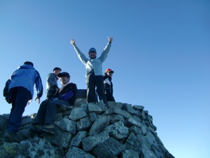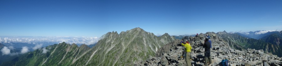 | 全員で | 山頂は結構広い 北側の端まで行ってみる | 槍ヶ岳から歩いてきた稜線が見える |