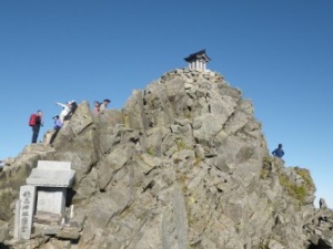 | 前穂高岳を目指す | 沢を挟んで霞沢岳 | 穂高神社嶺宮と書かれた祠 |