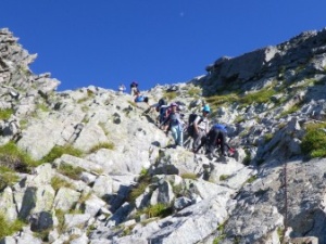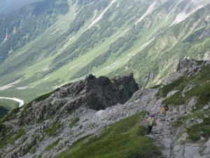 | 右手前が焼岳、一番奥が乗鞍岳 | これから歩く吊尾根 | 今日も岩稜歩きだ |