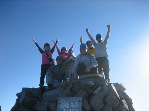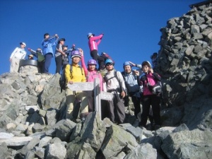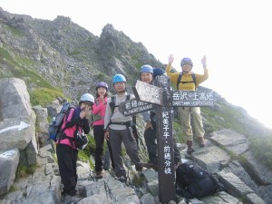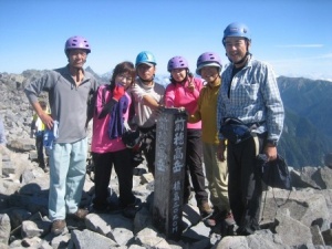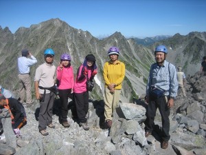 | 振り返ると遠くに槍ケ岳 | 前方にはジャンダルム | 奥穂高岳の山頂にて全員で |