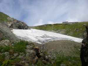 | 雪が残っている・・・右上は白馬山荘 | ||