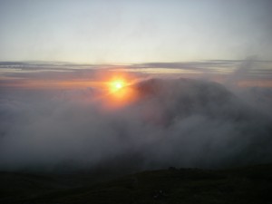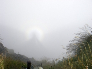 | 山頂にて | ガスの切れ間から雪倉岳への稜線が見える | ブロッケン現象(クリックで拡大) |