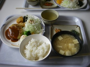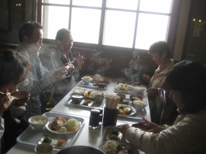 | 夕食は食堂で(MORIさん撮影) | メインはヘルシーハンバーグ | 夕焼けを見ながら |