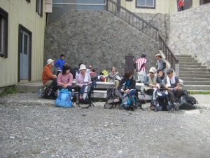 | 山荘の外にもテーブルがある | ガスって見えない | チェックインはこの右で |