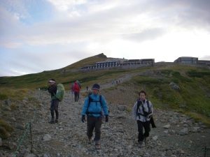 | 出発前に(MORIさん撮影) | 山荘を背に | 大雪渓と旭岳への分岐 |