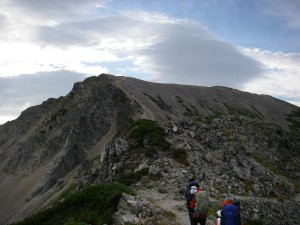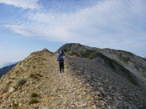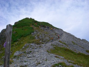| 振り返る | 次は鑓ケ岳を目指す | このピークを超えるとヤセ尾根となる |