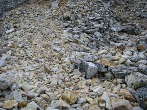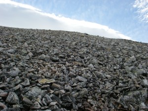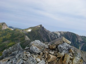 | こんな石ころが積み重なっている | 杓子岳山頂にて | 山頂から見た白馬鑓ケ岳 |