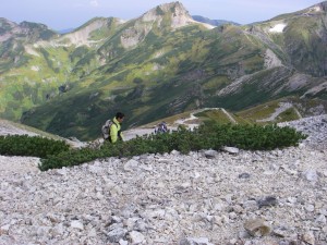 | こちらは白馬岳 | 強風の中、絶景に見とれる | ここも石ころだらけ |