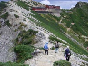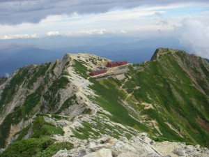 | 東側を見下ろすと山荘が | ここまで歩いてきた峰々 | 山荘へと下る |