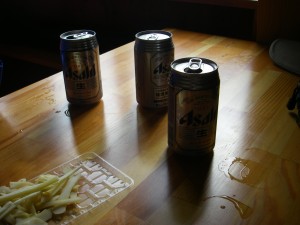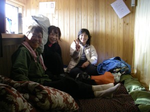 | 上にも部屋がある。6人ぎりぎり | 唐松岳を見ながらもう一度ビールで乾杯 | 夕食(器は全て破棄できる物) |