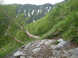 | わかりにくいが斜面は花 | 高嶺の奥が地蔵岳 | 大樺沢二俣からの合流点 |