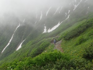 平成29年7月14日(金) 天気 弱雨 ■出発時間:午前4時30分(白根御池小屋) ■メンバー:単独 前日は新宿駅からJRと登山バスを乗り継いで広河原から白根御池小屋まで約2時間半ほど歩いた。単独行の一番つらいのは、小屋で一人寂しく過ごす時間であるが。今回は小屋のスタッフの方や岩手から来られたご夫婦と楽しい会話ができとても有意義な時間を過ごせた。本当に感謝である。 今朝は長丁場となるため午前4時半に出発した。未だ、外は薄暗い。 草すべりと言われている道をやさしい日差しを背に受け、歩き始める。裸電球で照らされたような道端には、花々が飾られたように咲き、賑やかである。1時間半くらい歩いたらさすがに腹が減ってきた。朝食は弁当にしてもらったので北岳から伸びる稜線を見ながらのんびりといただく。再び、歩き始めると一人の若者に追い越される。何とも元気の良いことか。 順調に歩いていたが、急に下腹に異変が・・・・・。簡易トイレを持ってきて正解だった。 そしてこの期待していないお土産は最後まで持ち歩くことになるのである。 さて快調(腸)となった私はお花畑で水分補給をしていると先を散策されるように歩いているご夫婦を目にする。昨日、小屋で楽しくお話しさせていただいたご夫婦に再会である。今日は農鳥小屋に宿泊とのことで時間に余裕がある。きっとこれからの道程で度々お会いすることと思い、先に進む。お花畑が続いて大樺沢二俣との合流点近くでは広河原を挟んで反対側の鳳凰三山の峰々が見渡せる。白根御池からは見えなかったオペリスクが高嶺の奥にちょこんと見えた。 小太郎尾根分岐に立つとガスの中で絶景はお預けのようである。 ここからは稜線歩きで眺めが良いはずであるが、残念ながら霧雨で視界は悪い。 その代わりに見える範囲はたくさんの花々が瑞々しい姿で楽しませてくれる。 霧雨は弱雨となり雨具を着る。少々肌寒かったので丁度良いかも知れない。 北岳肩ノ小屋では、既に宿泊登山者は出発済みのようで静かである。 ここは雨水が頼りとのことで水は貴重である。 北岳肩ノ小屋を後に再び花々を見ながら歩く。切れ落ちた東側の斜面には時折、雪渓がガスの中に浮き立つ。両俣小屋分岐からは、磯で良く見る海苔のついたような岩々がゴツゴツと続く。 次ページへ 前日へ戻る |