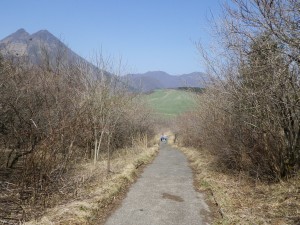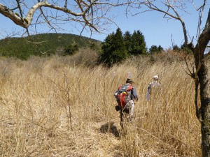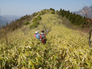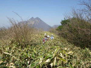 | 下山は直登コースを | クマザサの中を | 由布岳を見ながら歩く |