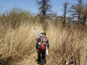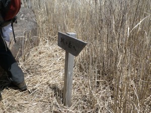 | 樹林帯を抜ける | 湿地帯を歩くがしんさん | 1114mピークにある道標 |
