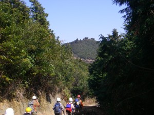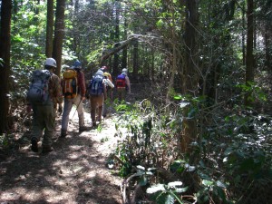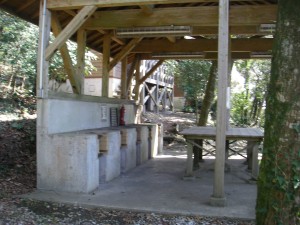 | 登山口は鳥居から | キャンプ場の炊事棟がある | 木洩れ日の中を |