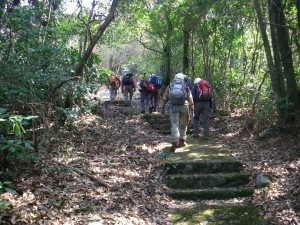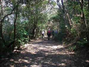 2011年3月13日(日)天気晴れ 「自然観察とボランティアの山の会」の4月例会登山の下見ということで車2台で天草の最高峰、倉岳を歩きました。参加者は男性6名と女性3名でいつものように6時半に小倉を出発し、途中有料道路を行過ぎて大廻をしてしまい到着時間がかなり遅くなってしまいましたが、結局倉岳に登るには、車道でほぼ山頂まで行くルートしか見つからず、登山としては少々物足らない歩きになりそうです。しかし、倉岳山頂と矢筈岳山頂からの展望は、倉岳登山口駐車場にある「眺めなら日本一」と彫られた石柱の通り、絶景です。やっぱりここまで来た甲斐があったと思うのです。 <コース詳細> 倉岳登山口と言ってもほぼ山頂で、ここまで南側の倉岳町からも北側の栖本町からも車で来れます。広い駐車場にはトイレもあります。登山口と書かれた標識の横の鳥居をくぐり、参道を歩きますが、キャンプ場になっているようで炊事棟があったり広場があったりします。駐車場から約10分程度で倉岳山頂です。ここで絶景を楽しみながら昼食を済ませ、再び駐車場に戻ります。次は矢筈岳を目指します。栖本町への車道側の横に道がありますので入り込みます。しばらく歩くと一旦車道に出ますが、標識があるところから再び登山道に入ります。さらに歩くと「倉岳⇔湯船原」と標識がありますが、南側に延びている登山道を進みます。道は狭く、歩きづらいのですが、登山道らしさを楽しみます。左手を見ると林道(作業道)が、平行しているようです。 倉岳登山口から 分程度歩くと林道(作業道)に飛び出ます。しばらく広い砂利道を歩くと立派な鳥居があってさらに小さな鳥居が見えると矢筈岳山頂です。水俣方面を見渡してしばらく絶景を味わいます。帰路は往路も行けますが、林道(作業道)を歩くことにしました。どちらもさほどアップダウンはなくのんびりとした歩きが楽しめます。林道(作業道)は倉岳登山口駐車場の「金比羅宮参道入口・・・・」と彫られた石柱のところに出ました。 <コースタイム> 倉岳登山口P-(10分)-倉岳山頂-(10分)-倉岳登山口P-(45分)-矢筈岳山頂-(40分)-倉岳登山口P ※休憩時間は含まれていません。全行程で約2時間20分かかりました。 <哀悼> 一昨日の3月11日(金)の午後に東北で震災がありました。とても信じられない出来事で亡くなられた方、被災された方やその家族の方のことを考えると心が痛みます。今回は、その痛みを感じながら、そして1日でも早い復興を願いながらの登山でした。 |