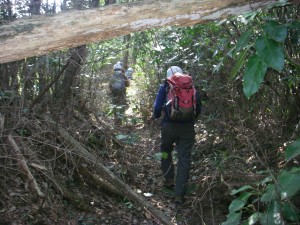 | 左手は倉岳へ、右手は湯船原 | 自然の障害物を避けて歩く | 青空に咲く黄色い花 |