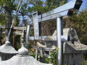 | 祠と小さな山頂標識 | ステンレス製の小さな鳥居に金比羅宮とある | 素晴らしい眺めです |