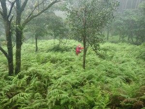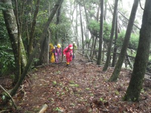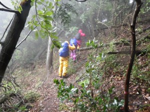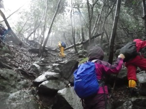 2011年9月4日 天気 雨 自然観察とボランティア山の会の10月例会は英彦山系の山で岳滅鬼山の計画をしていた。その下見ということで雨にもめげず女性2名と男性3名のパーティで出発した。 当初の計画では斫石峠から釈迦ケ岳へ登り、峰入り古道を岳滅鬼山を目指し進み岳滅鬼峠からシャクナゲ荘へと降る計画であったが歩行距離と岳滅鬼山から峠までのルートの状態を考えると浅間山へ降る方が良いだろうと意見が一致し、今回の下見は釈迦ケ岳から浅間山へと周回するコースを設定した。 しかし、歩いてみて峰入り古道は、倒木が多く、またシダやカヤが覆い茂ってわかりづらかったり、歩きにくく、予想した以上に時間がかかった。さらに浅間山からの降りは、急斜面ということもあり雨が降るとズルズルでとてもまともに歩けないことがわかった。また、沢を二ケ所渡渉する所があるが、以前来た時は水がほとんど流れてなかったのが、今回は滝のようになっていて雨天決行できるルートでないことがわかった。結局、この下見で計画を根底から検討しなおす必要があると判断した。 <コースタイム> 斫石トンネル登山口-(45分)-釈迦ケ岳頂上への分岐-(30分)-湯谷越-(100分)-深倉越-(30分)-浅間山頂上-(75分)-登山口 ※休憩時間は含まず。全工程で約5時間かかりました。 |