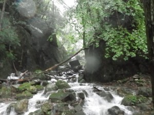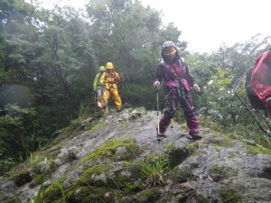 | ちょうど雨が止んだので昼食 | 降りはズルズル | 沢コースは水がすごい |