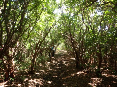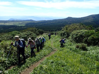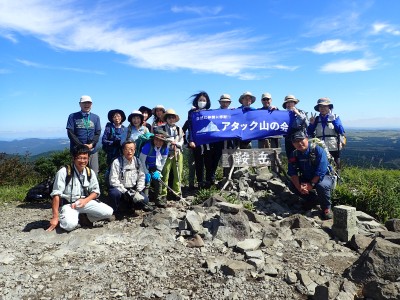 彼岸も過ぎ、ようやく朝晩は涼しく感じるが、日中は未だ30度と猛暑である。しかし、鞍岳の登山口の駐車場に着くとさすが9合目、標高も高いせいか、予想以上にとても涼しい。準備体操を済ませ出発。まずは女岳、強風の中、マツムシソウの花が揺れていて細い体でか弱そうに見えるが、踊っているように見えて楽しそうに見えるから面白い。風に吹かれながら当メンバーは山座同定を楽しんでいる。そして次は鞍岳。賑やかな一行は狭い頂で360度の展望を楽しむ。ここで集合写真を撮り次はツームシ山。一旦降り、アセビのトンネルを抜け明るく平坦な道を行くと緩やかな登り。廻りが開けるとツームシ山の頂上は近い。振り返ると帽子のようなUFOのような鞍岳頂上部が見える。ツームシ山頂上に着くとのんびりと昼食をして眺望との別れを惜しんで下山。少し往路を戻り花コースを歩く。この時期に期待するはずもないミヤマキリシマが数株だけ花を咲かせていた。しかもその株は満開状態である。とても不思議な光景だが、思ってもないプレゼントのような気がした。(でもよく考えるとこれも異常だと言える)