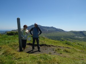 | 前ページから 家内が遅れ気味に階段を上る。振り返ると烏帽子岳にステージのように広がる草千里が面白い。階段は、よくある神社のように真っすぐ続く。景色がなければ、正直上りたくない。ようやくの思いで上りきると阿蘇の荒々しい峰々が目に飛び込む。10時50分杵島岳山頂。記念写真を撮ってお鉢周りの道を探す。家内がすぐに西側への道を見つけたので斜面を降る。ここから火口縁を右回りで進む。男性登山者が一人三脚にカメラを構えて撮影していた。私たちを追い越した登山者が反対回りですれ違った。往生岳への取り付きを過ぎたところで火口跡を眺めながら昼食をとることに。今日はお湯を持ってきたので味噌汁(家内はカップワンタン)と家内の手作り弁当を食べた。のんびりと昼食を済ませて取り付き地点まで戻り、往生岳との鞍部まで急斜面を降る。道はなぜかボコボコしていて歩きづらい。杵島岳の東面にも小さな火口縁がある。その火口縁の一番北に位置する当たりに往生岳への取り付きがテープと踏み跡でわかった。ここから西に戻るように杵島岳の山腹を歩くと往生岳の裾とつながった鞍部に出る。杵島岳を一人降ってくる人がいた。往生岳へと歩を進めるが、牛の糞が多いので避けながら進む。急斜面に取り付くと道はジグザグになり高度を上げてゆく。後ろの下の方に米塚が可愛い姿を見せている。ようやく上りきって山頂標識を探すがない。もう一度持ってきた地図を見る。どうもも少し先の北側のピークのようだ。高さはこちらの方が高いと思うが・・・・・何しろ三角点は高いところにあるとは決まっていない。北へと道を一旦降り、左に穴が開いたような絶壁の縁を過ぎ、平らな広っぱを北へと真っすぐ歩くと山頂標識があった。しばらく展望を楽しみ来た道を戻る。が・・・・杵島岳の山腹の下の方を近道と思い進むが途中で灌木帯に入り込み、動きがとれなくなってしまった。止むなく戻り来た道を戻る。火口縁に戻るとここから縁を右に回る。道には牛の糞がところどころあってしかもデコボコしている。上りになって一旦下るとすぐに舗装された遊歩道に出る。西に歩いてゆくと杵島岳山頂と標識があるT字路に出る。ここからは往路を戻り、草千里へと遊歩道を歩く。駐車場に着いたのは14時15分だった。 <コースタイム> 草千里P-(60分)-烏帽子岳頂上-(30分)-道路から遊歩道-(20分)-T字路杵島岳山頂への標識-(20分)-杵島岳頂上-(15分)-往生岳取り付き点-(20分)-鞍部-(25分)-往生岳頂上-(20分)-鞍部-(50分)-遊歩道-(15分)-T字路-(20分)-草千里P※休憩時間は含まず。全工程で約6時間かかりました。 <おまけ> 温泉は天然温泉の「南阿蘇村総合福祉温泉センターウィナス」に立ち寄る。入浴料は何と300円。阿蘇郡南阿蘇村河陽4530TEL0967-67-2277 |