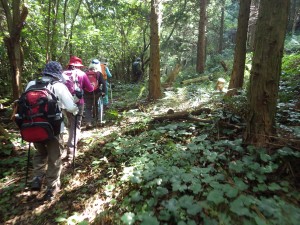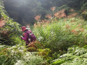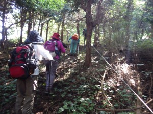 | 植林帯と自然林の境の尾根を歩く | ||