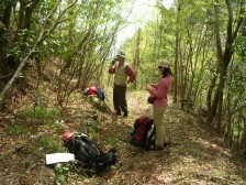 | 舗装された林道に出てしばらく歩く | 登山道はわからない | 地図とコンパスと勘で進む |