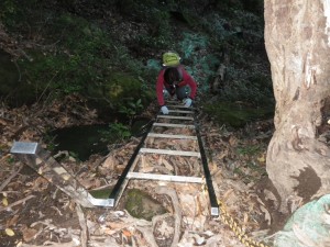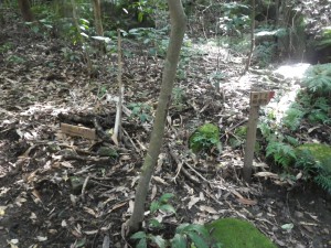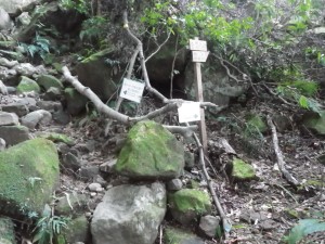 | 緑色のビニルは土嚢袋 | 尾根コースと谷コースと分かれ(7:53)る | 尾根コースはすぐに梯子 |