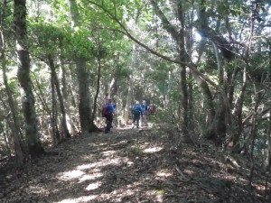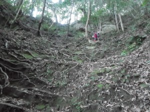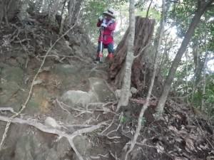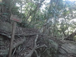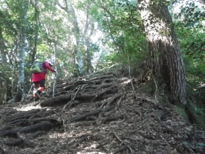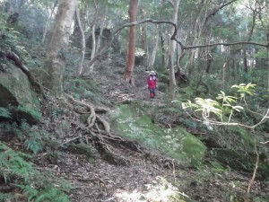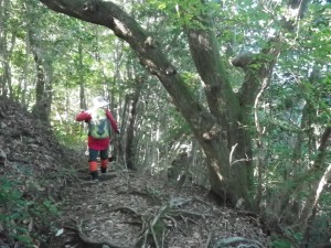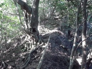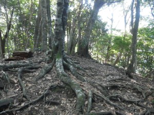 | さらに露出した根の多い尾根道を進む | きれいな林だ | 尾根は右側が切れ落ちている |