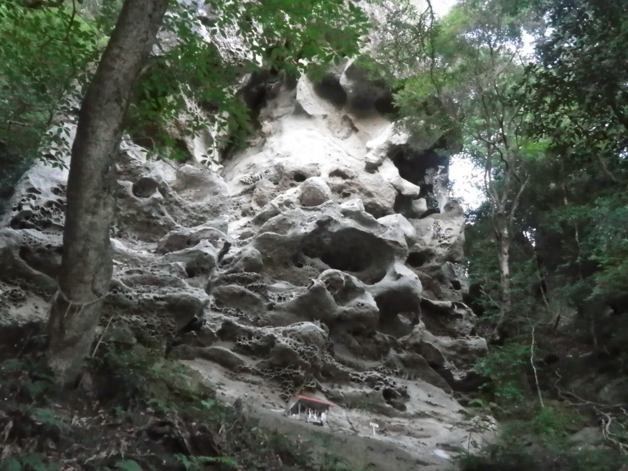 | ▲天狗岩の下部には針ノ耳神社が祀られている(迫力満点) | ||