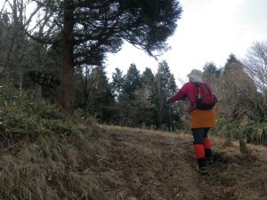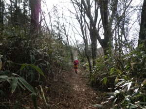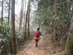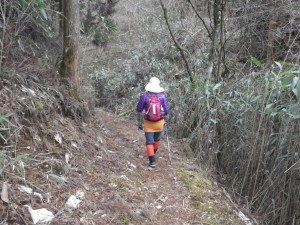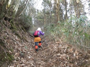 前日の保口岳へ 2013年3月17日(日)天気曇り ■出発時間:AM6時40分 五木村 「ログハウスもみじ」 ■メンバー:家内と二人 カタクリの花でお馴染みの雁俣山を二本杉峠を挟んで南西に位置する大金峰は、南に稜線を延ばして小金峰がある。昨日はそのまた「奥の方」と言う表現がふさわしい保口岳を歩き、五木村に宿泊し、今朝、狭い国道を約1時間かけて大金峰登山口へと到着した。 大金峰・小金峰は「だいきんぽう・しょうきんぽう」と読んでいたが、地元の人は票題のように呼んでいると九州百名山地図帳には書かれている。 昨夜は、と言うか夕方早くに鍋を食し、暖房がないため寒いので寝袋に入り、何もすることもなく眠ってしまった。おそらく8時前には、眠ってしまったろう。人間良く眠れるもので起きたのは5時半であるから9時間以上寝たことになる。 朝食を済ませてお世話になったログハウスを後にし、国道445号線を二本杉峠方面を目指す。 峠の手前の道標から左折すると九州自然歩道の大きな案内板があり、その奥が駐車場になっていた。今のところ訪問者はどうやら私たちだけのようである。 7時40分、登山準備をして出発。まず丸太の階段を歩き杉林から沢を横断するとマムシ注意の大きな看板が目に付く。ブナや松の巨木が目に入るが、すぐに植林となり尾根に飛び出す。やはりこの辺りの山は、開けた場所にレスキューポイントの表示板がある。造成中の作業道のようで登山道がわかりにくいが、稜線沿いに歩くと小さな表示もあって道ははっきりとしてくる。植林帯からクマザサの茂る自然林は、ほぼ平坦である。左にカーブするところで大金峰への表示があって左のきれいな尾根を登る。5分程度で頂上に着くが、木の間から透かすように西側の展望があるだけで背は植林帯で覆われている。分岐まで戻り、快適な縦走路を再び歩く。妻とたわいのない会話でいつのまにか攻分岐に着く。ここから東側の風景を見ながら歩く。赤松の並木道が少しだけだが印象的だ。登山道は作業道で寸断されている。ここでも山肌に大きな傷を負わした罪を同じ人間として感じないわけにはいかなかった。(ごめんなさい ごめんなさい) 道は桧から杉の植林帯を稜線の西側を歩く。当然ながら展望は無い。登りきった明るい場所に出ると、小金峰と朴の木への分岐点である。東に歩を進めると笹の中にブナなどの背の高い木が曇り空を背景に枝を延ばして絵にしたい風景である。道は急登となるがワクワク気分で上を見ながら登る。シャクナゲが群生していると頂上が近いと感じる。様々な環境の中で頂上辺りがきっと居心地良いのであろう。尾根が痩せているように感じると三角点の木柱を見て標識のある開けた小金峰頂上に着く。展望は木の枝があるので大展望と言うわけにはいかないが、それでも北から東側を南にパノラマ撮影ができた。時計を見ると10時30分、昼食には少々早いが、朝が早かったのでここでランチタイムとした。ちょうど食事が終わるころ空からポツポツと雨粒が落ちてきたので雨具を身につけ下山開始。帰路は往路を戻る。植林帯で本日初めての女性2人の登山者と出合う。と思っていたら男性一人が座り込んで携帯で話をしていた。少々気になったが会釈だけして通り過ぎた。大金峰を過ぎると雁股山が見えてくる。とてものんびりとした登山である。登山口に着くと気になっていたことが、判明する。先ほどの登山者の所有と思われる四駆の車のタイヤがパンクしているではないか、おそらくここでは携帯が繋がらないので繋がる場所で話をしていたのであろう。それにしてもスペアタイヤは用意していなかったのであろうか・・・・・・。 2日間の旅は、順調に終わりそうであったが、この後、高速道が植木-南関間事故のため通行止めで渋滞に巻き込まれ、結局自宅に着いたのは19時を過ぎてしまった。おばあちゃん、レオちゃん、ごめんなさい。とにかく今回も自然に山に感謝です。ありがとう! <コースタイム> 登山口-(70分)-大金峰頂上-(50分)-攻分岐-(25分)-朴の木分岐-(10分)-小金峰頂上-(40分)-攻分岐-(90分)-登山口※休憩時間は含まず。全行程で約5時間半かかりました。 |