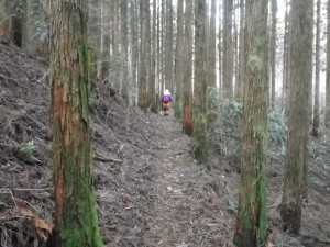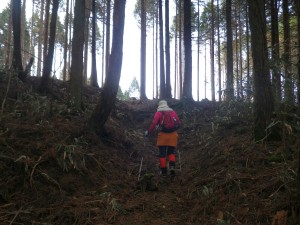 | 奥の丸太の階段が登山口 | 小石の上に落ち葉が広がる | 杉の植林帯 |