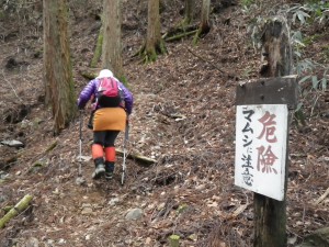 | 沢を横断 | マムシに注意 | かなりえぐれた道だ |