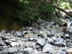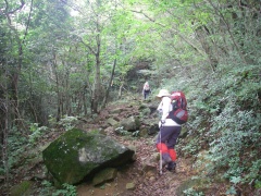 2009年9月13日 天気 晴れ 天気が良さそうなので家内を連れて山に行こうとなり、どこに行こうかといつもの通り、気まぐれ登山の日となった。出かけるのが遅くなると近くの山しかない。そこで久しぶりに福智山に行こうとなった。福智山と言えば、先日のニュースで1人、谷に転落して亡くなったという。険しい山ではないが、油断は禁物である。 今回は、鱒淵ダム側が7月の大雨で通行止めと聞き、上野からのコースを行くことにした。上野(あがの)の赤池駐車場に午前10時20分到着。準備して出発だ。 山の紹介とコース詳細については過去の記録を 福智山山行記録(INDEX) <コース詳細> 赤池町駐車場から舗装道を温泉(白糸の湯)、山荘を左手にし、少し歩くと登山口です。沢沿いに進み「虎尾桜」の分岐標識を右に見てさらに進むといつのまにか沢の中の石を踏みながら10分程度歩き階段を駆け上がると堰堤(えんてい)の上に出ます。さらに10分で林道に一旦出ます。林道を横断し、約15分で上野越です。西は鷹取山へ、北は内ケ磯へ、東は福智山となります。途中、鷹取山を見下ろし、谷間を左手にして林の中、高度を上げます。山頂まで0.3kmの標識があって、水場を越えると急に開けて正面に山頂下の岩が見えてきます。Y字路になりますが、右でも左でも行けます。今回は左手に進み、下山は右の道を降りることにしました。急斜面ではありますが、ススキの気持のよい道を登りきると山頂です。下山は往路を戻ります。 <感想等> 相変わらず人気の高い山で山頂ではたくさんの人で賑わっていました。上野コースは、山頂まで最短で登れるのですが、その分楽しみは少ないと思います。早く七重の滝コースが復旧できればと願います。それと水場の水が枯れているようでした。 |