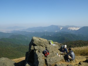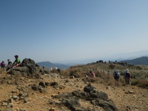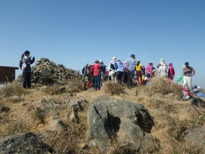 | 山頂は大勢の登山者で賑わう | 展望を楽しみながらランチタイム | 労山の清掃登山で集まった人達 |